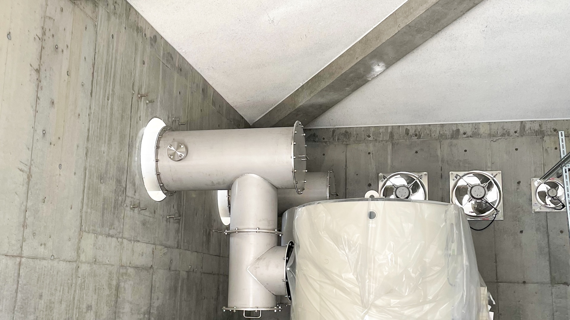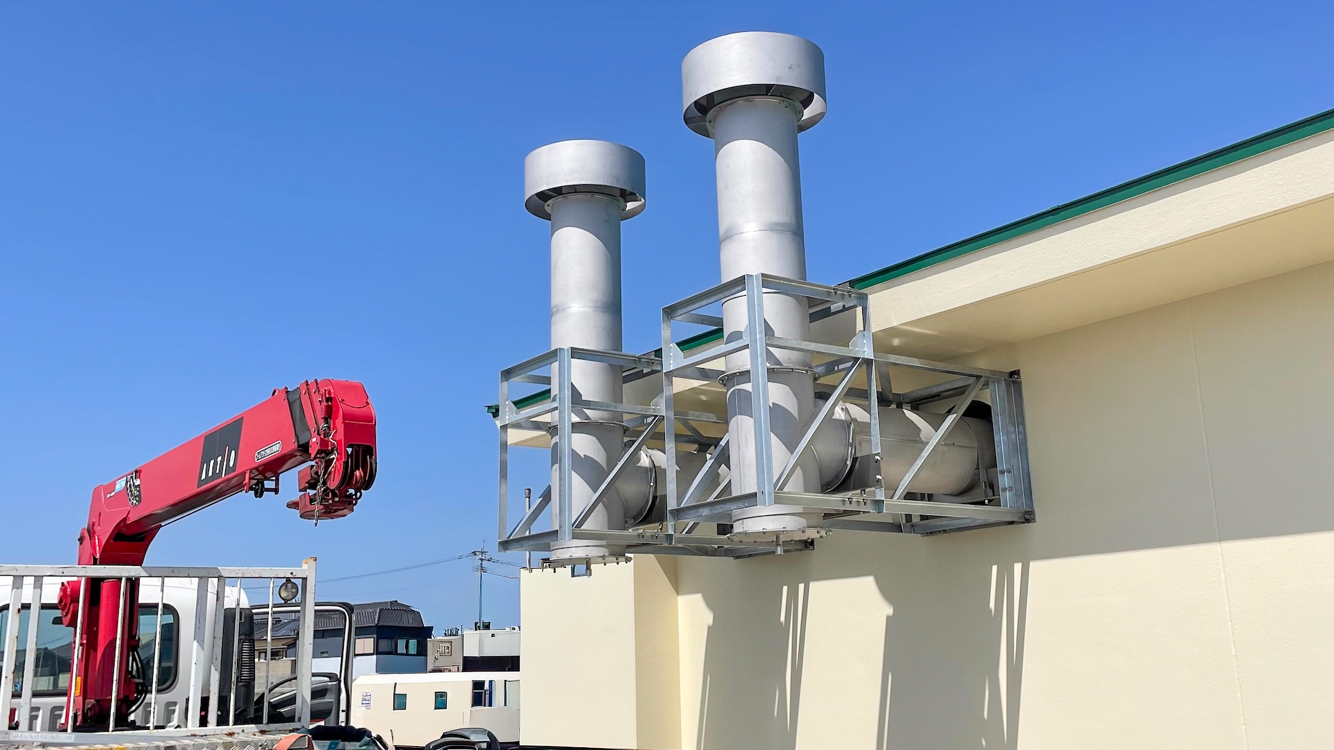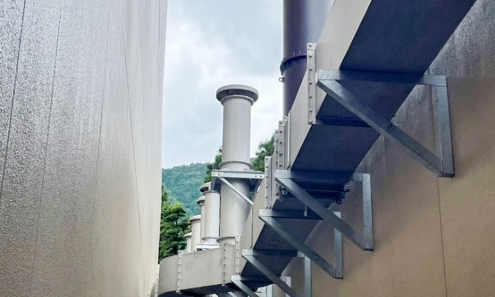 SERVICE 06 煙道工事 新築現場の煙道工事から、ボイラー交換に伴う煙道接続部の改修工事まで、幅広く製作から据付まで対応致します。 煙道の製作・取付には、正確な寸法取りと豊富な経験が不可欠となる為現場での打ち合わせ及び採寸、製作から取付工事まで一貫して対応いたします。 製作・施工実績